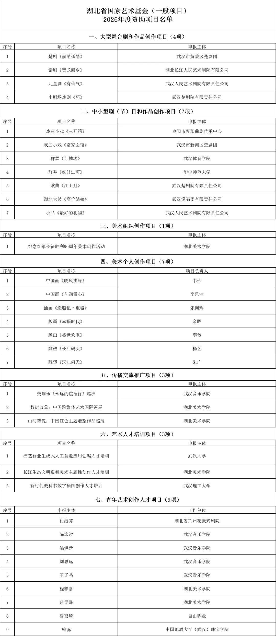 既有湖术学院牵头的留念赤军长征胜利90周年美术创做勾当,涵盖戏曲小戏、群舞、歌曲、湖北大鼓等多种艺术形式;位列全国第8,由武汉大学、湖术学院等高校牵头培育专业人才;大型舞台剧和做品创做项目4项。湖北省34个申报项目成功入选,美术类项目共8项,此中有四类项目拟立项数量居全国前10。武汉音乐学院的交响乐《永久的焦裕禄》巡演、湖术学院的跨艺术国际巡展等3个项目将帮力湖北艺术全国、接轨国际;